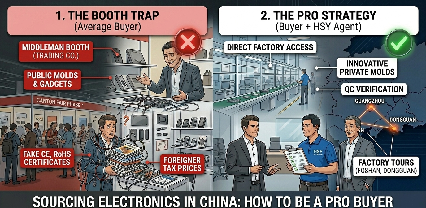 Coming to Guangzhou for Phase 1? Let HSY Sourcing be your “boots on the ground.” We can help you vet exhibitors in real-time and organize factory visits in the Shenzhen-Dongguan-Foshan electronics triangle.