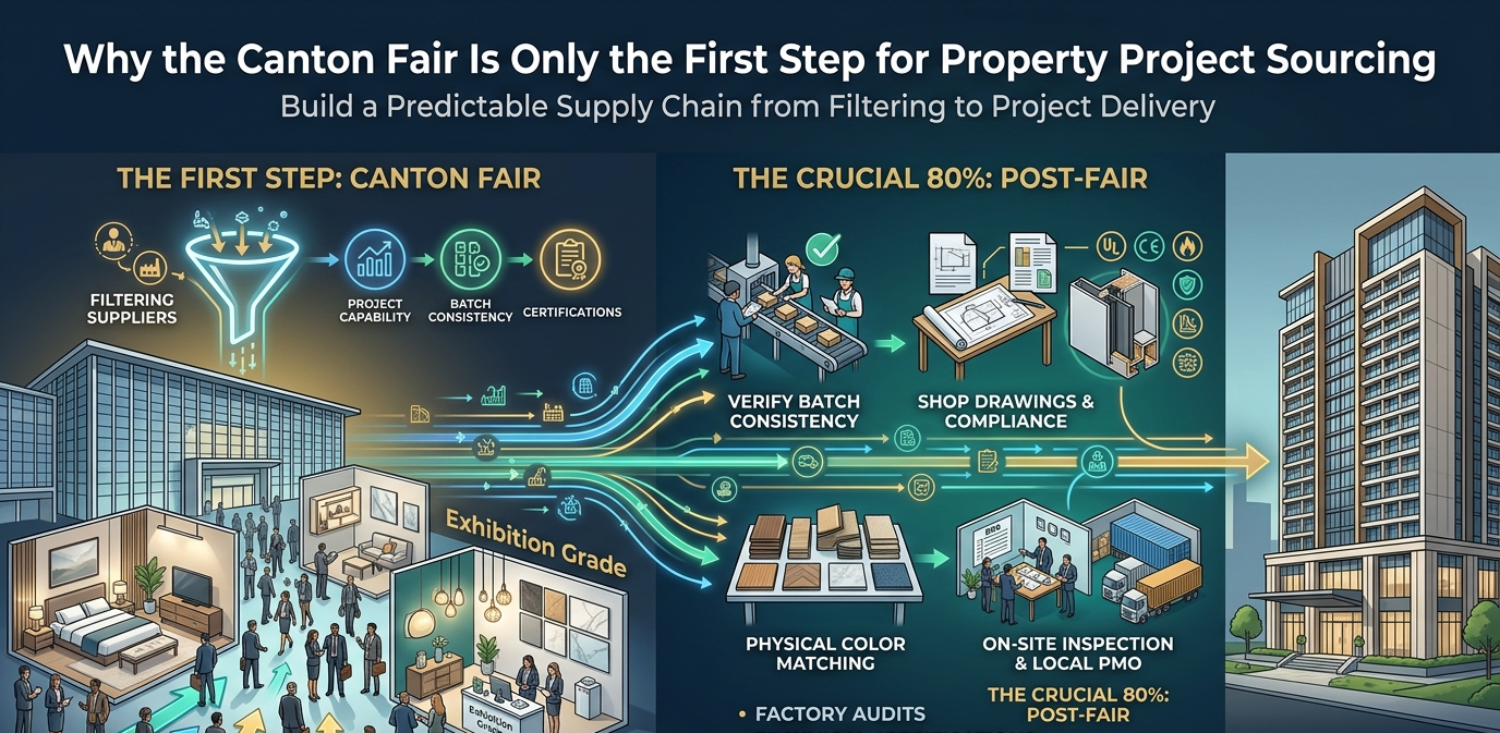 If you are sourcing for a multi-unit apartment complex or a high-end hotel, signing a contract on the exhibition floor is one of the riskiest moves you can make. Here is why the fair is only 20% of the journey, and what the other 80% looks like.