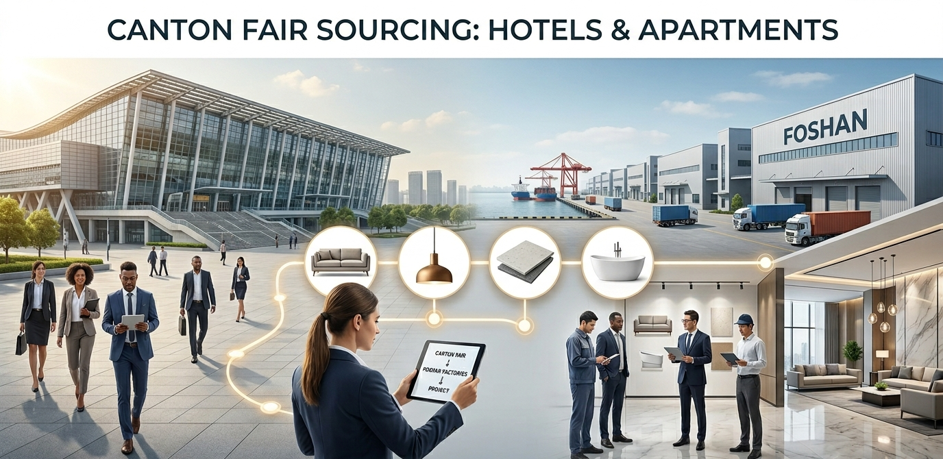 The Canton Fair is your shortlisting phase. For hotel and apartment projects, the real procurement happens in the days following the fair. You must travel to the manufacturing hubs—Foshan for furniture, tiles, and sanitary ware, and Zhongshan for lighting.
