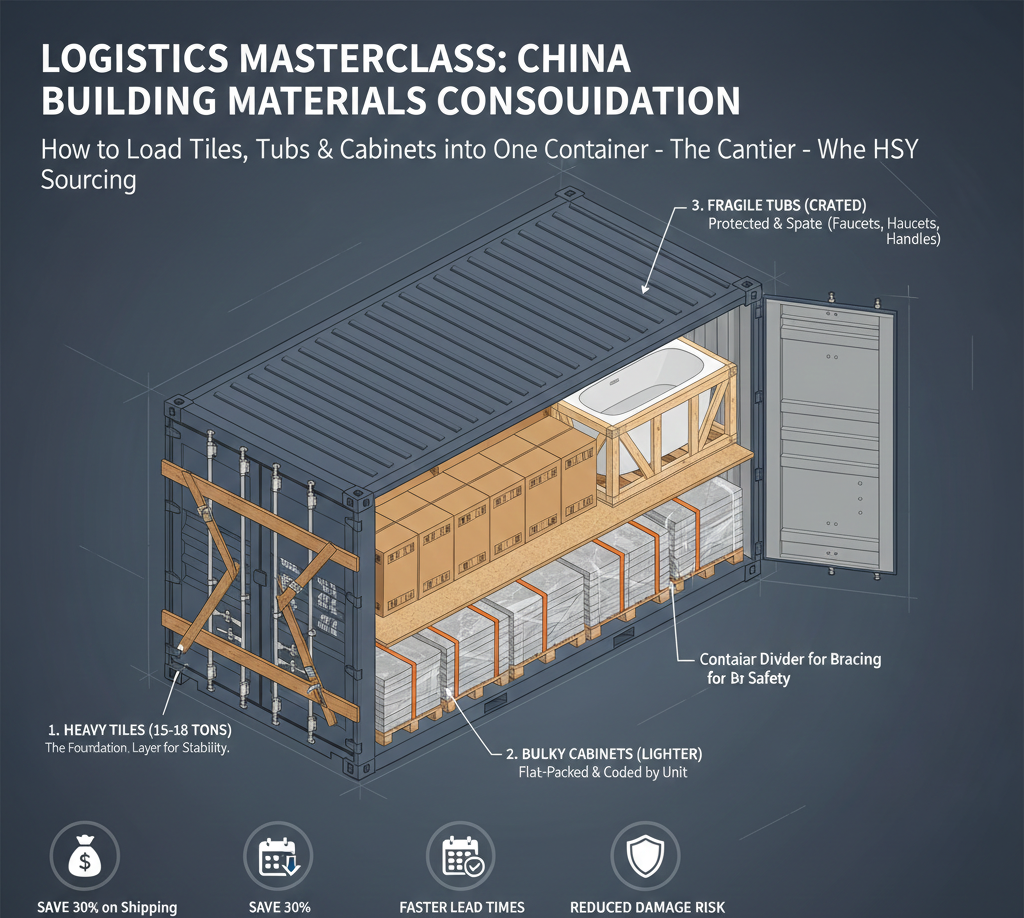 Importing building materials from China is not like buying something on Amazon. When you deal with multiple factories—a tile factory, a bathtub factory, and a cabinet factory—you aren’t just facing a “buying” problem. You are facing a massive “Consolidation” puzzle. If you get it wrong, you end up with shattered tiles, crushed vanities, and a massive bill for project delays.