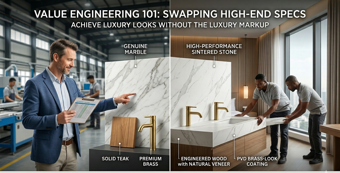 This is where Value Engineering (VE) becomes the most valuable tool in your procurement strategy. VE isn’t about “cheapening” the project; it is the process of identifying expensive, low-impact materials and replacing them with high-performance, cost-effective alternatives that maintain the 5-star look and feel.